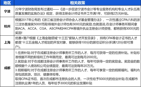 补贴政策。各省市为吸引人才,推出人才引进计划。对持有注册会计师证书的人才给予相应的政策福利和补贴。宁波、杭州、上海、成都等地均推出针对注册会计师的福利政策。